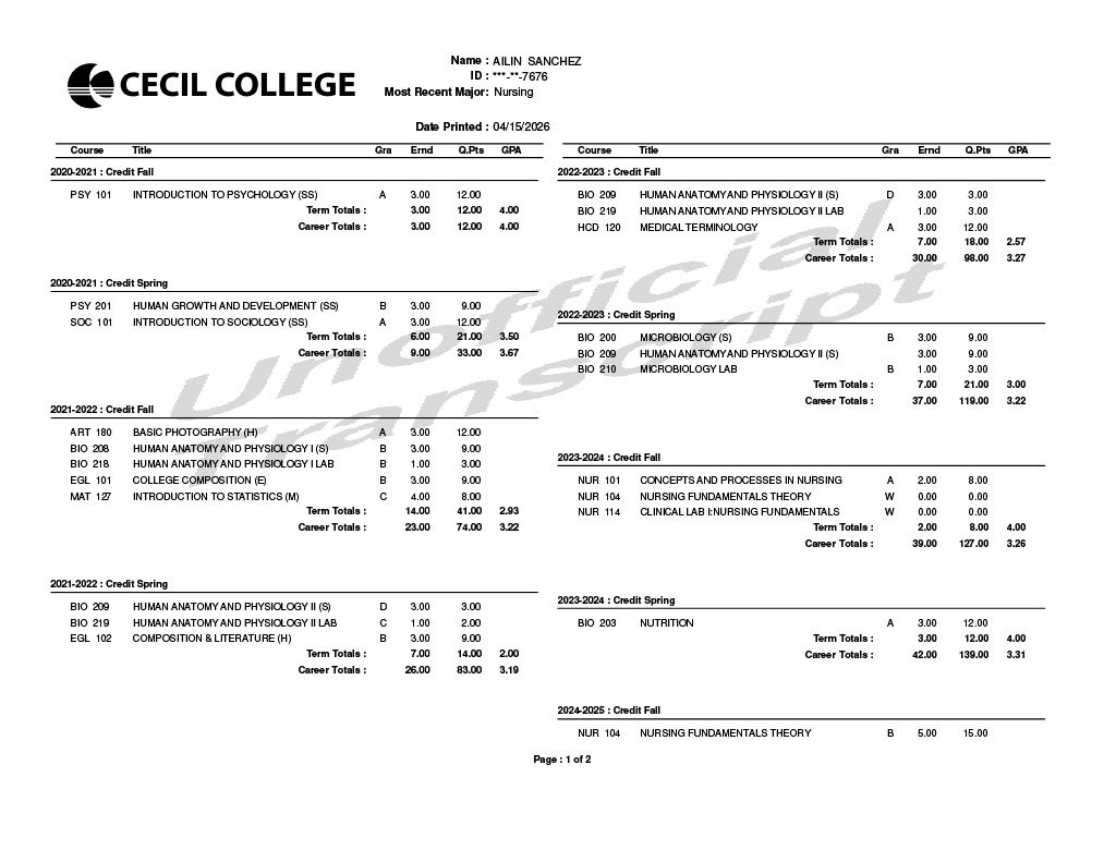 Educational Background This page features my unofficial transcripts from Cecil College and my current resume, which highlight my academic progress and professional experience. Please click on each document to view additional details.