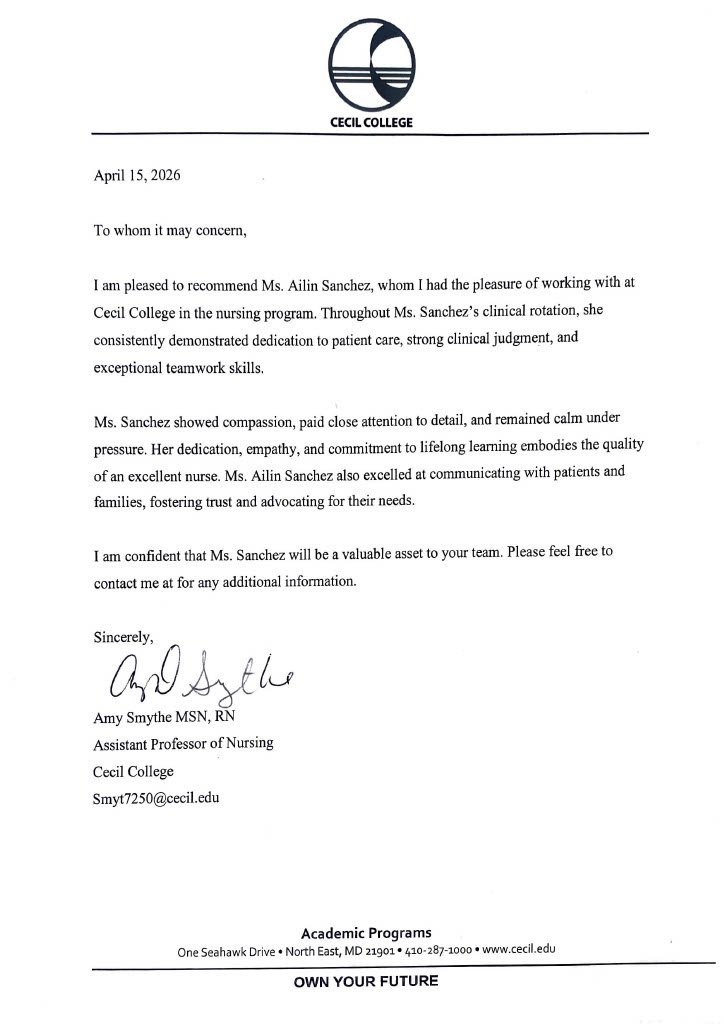 Below are letters of recommendation from my office supervisor and a nurse practitioner at my current workplace. As well as a letter from a clinical instructor. These letters highlight my clinical competence, strong work ethic, and commitment to delivering high-quality, compassionate patient care. They also reflect my ability to collaborate effectively with healthcare teams, adapt in fast-paced environments, and continuously grow as a healthcare professional.
